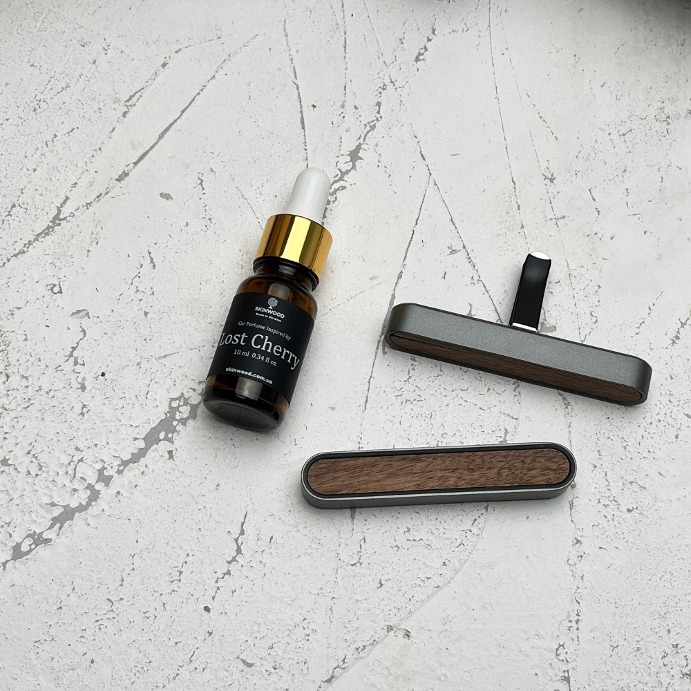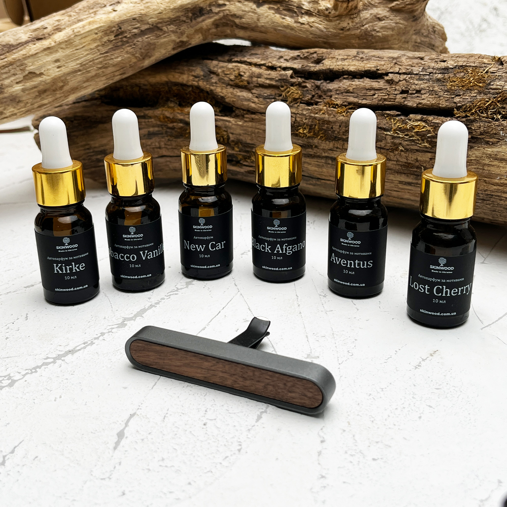 Цей багаторазовий ароматизатор виготовлений з натурального дерева та призначений для використання з парфумами або ефірними оліями, що дозволяє постійно оновлювати запах у вашому авто. У комплект входить тільки дифузор. Також є можливість придбати подарункову деревяну коробку з гравіюванням і флакон автопарфуму за мотивами світових брендів таких як: